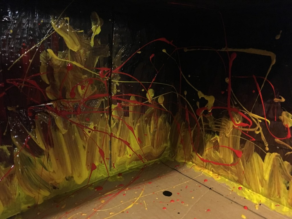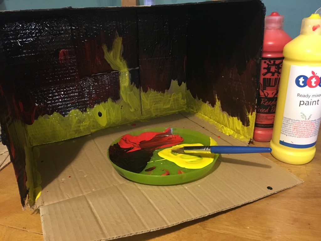 We started by painting the inside walls and roof of the box with black ready mixed paint. We then created a fire effect by splattering red, orange and yellow paint across it.