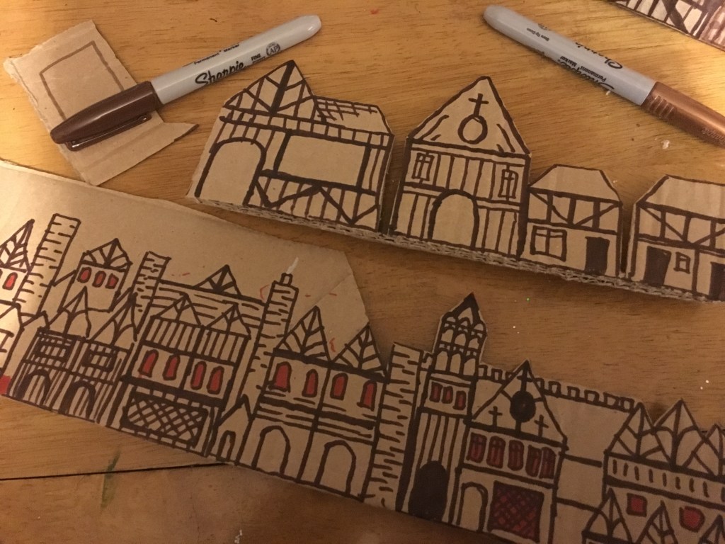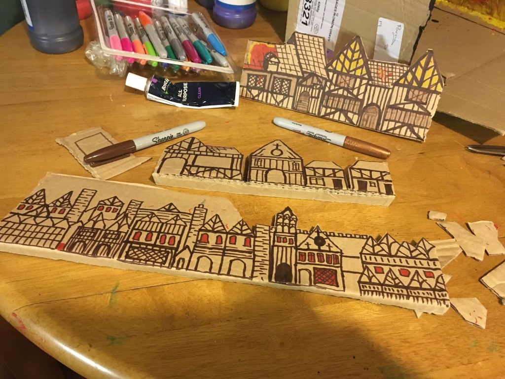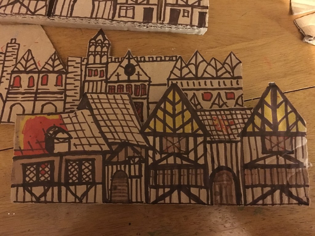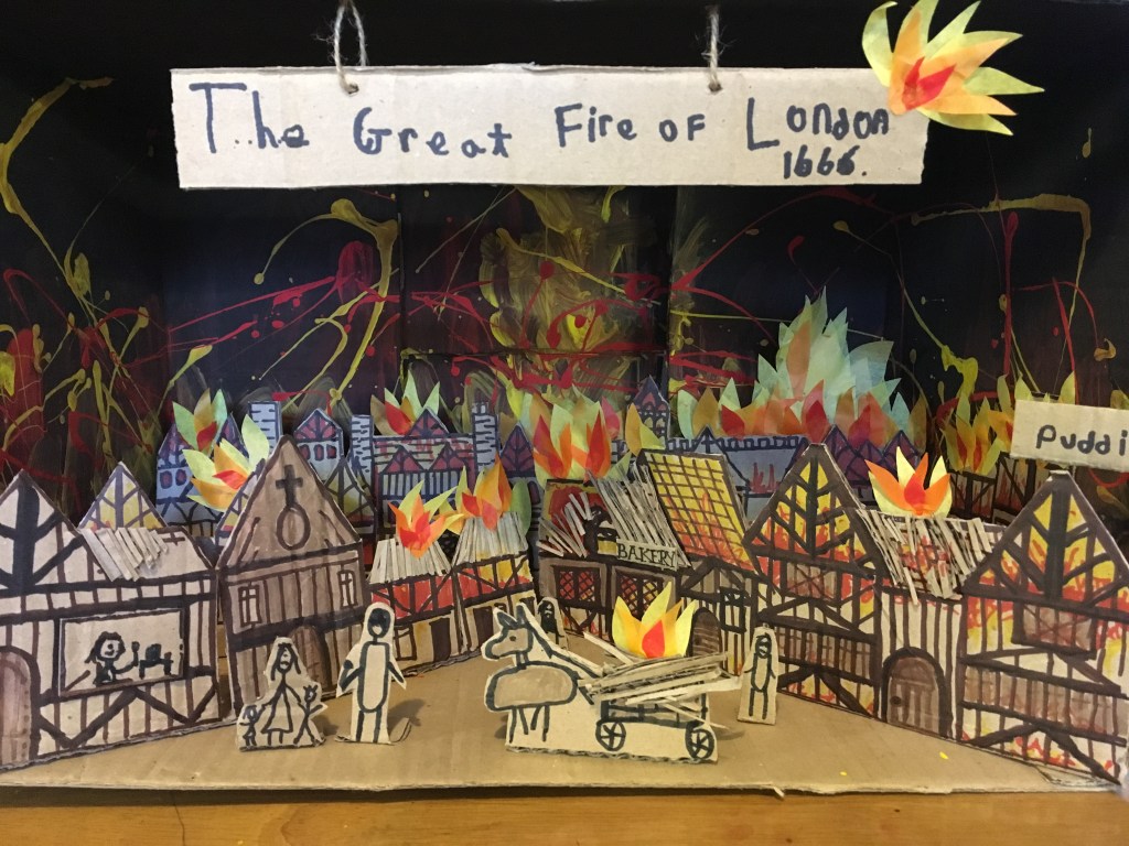 The Great Fire of London was the class’ term topic and all children were to make something related to that theme. We often use Shoe Boxes for crafts.