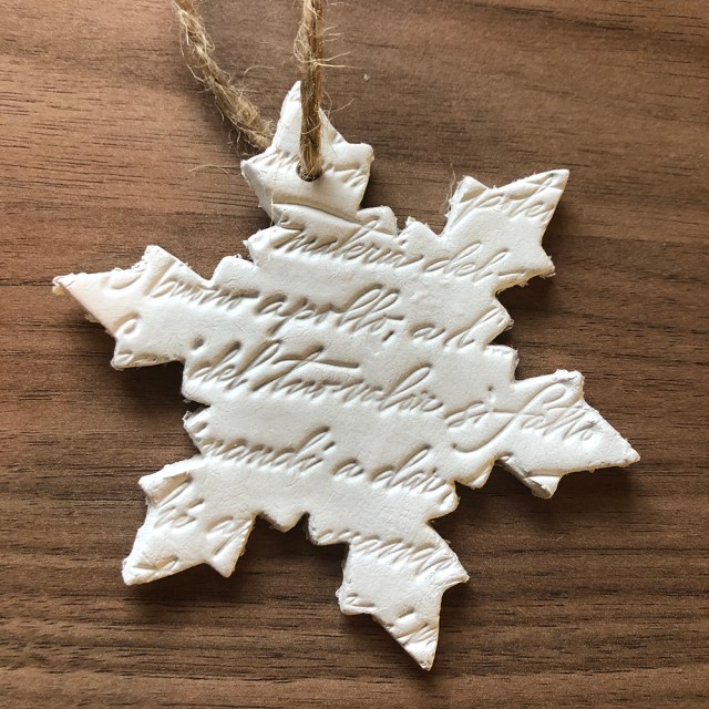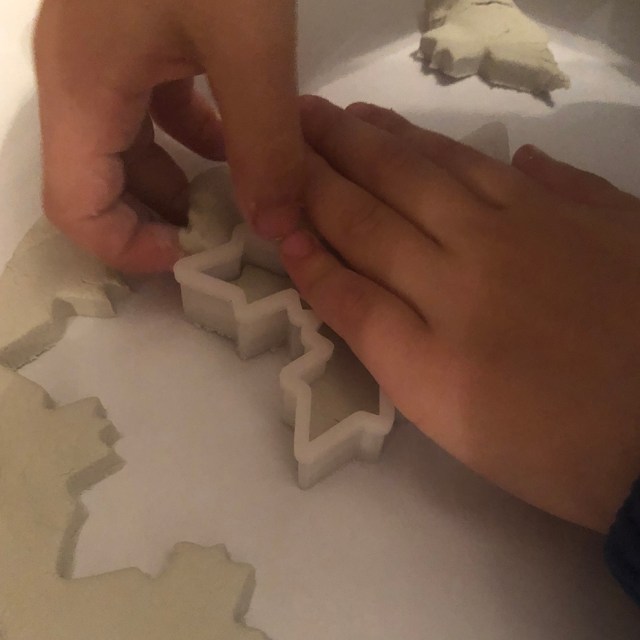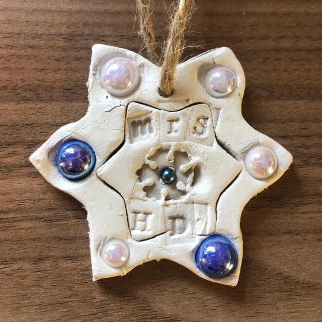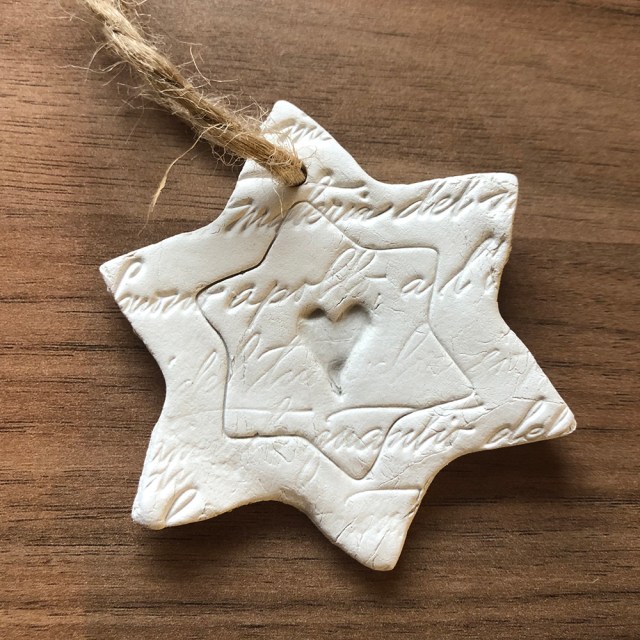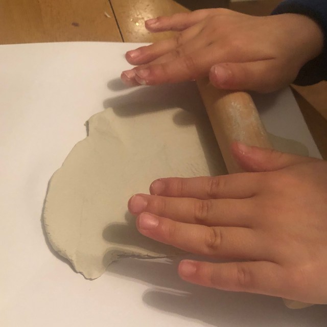 I provided them with clay, a rolling pin, cutting shapes, some rubber stamps to impress into the clay; including letter stamps for names and words, some beads, buttons and string for hanging.