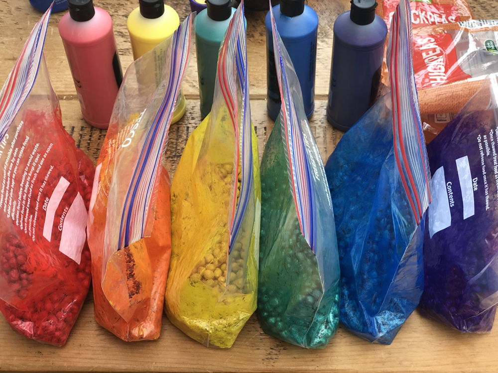 - Squidge the paint around with the chickpeas ensuring that all are coated.