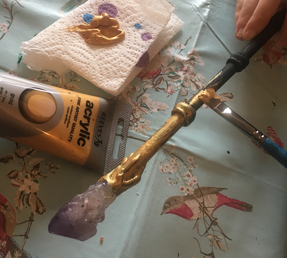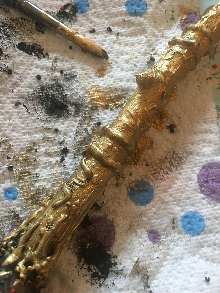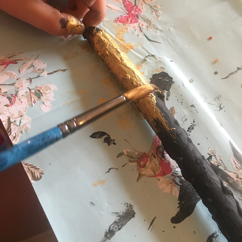The glue dries really quickly, so once dry, we painted the sticks and glue with acrylic paint. We used a base colour, of black for example or brown. We then added metallic gold highlights with a dry brush effect – this highlights the glue pattern around the stick. The beads painted make for a really great effect!