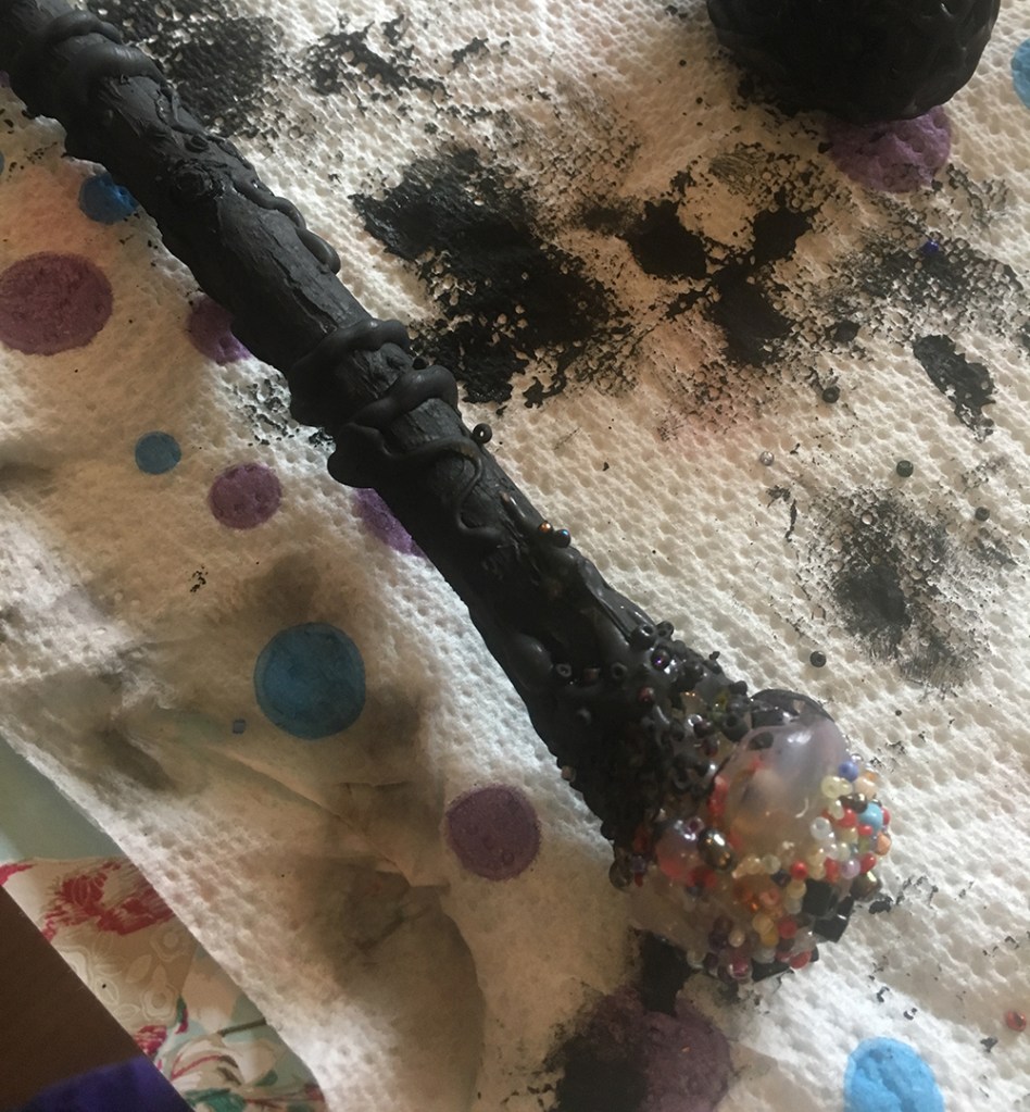 Using a low melt glue gun, we created a pattern around the sticks – the boys directed me as to how they wanted them. They added an extra large blob to the top adding beads or a skull head to the top before it dried. Please be careful with the glue gun – depending on the age of your children you may want to do the glue yourself.