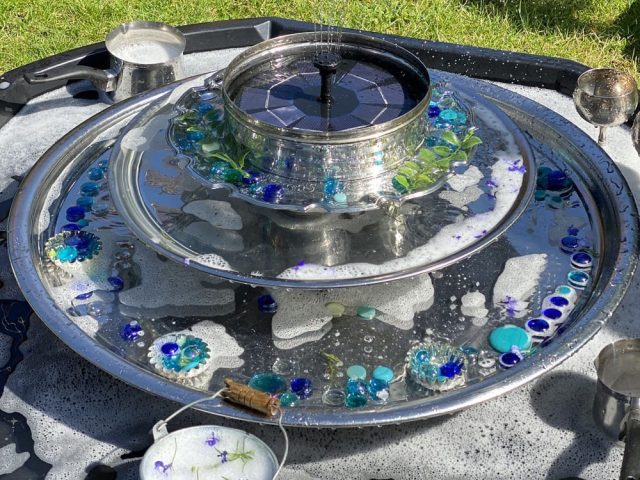 We love a mirror tray because they add awe and wonder into your play. This set up was to create a cascade of water so we stacked our differently-sized mirror trays in the tuff spot tray.