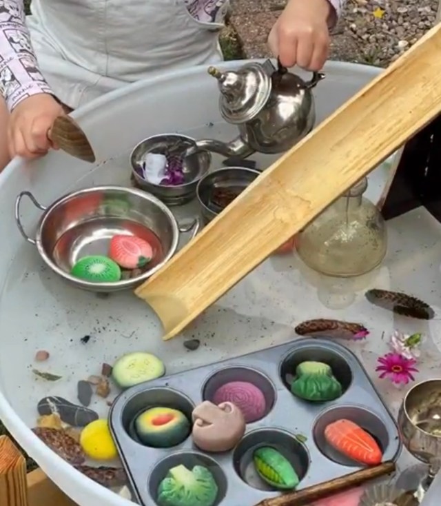 This can be used as a mud kitchen but also, not restricted to one so is a great space for invitations to play and set ups of all types.