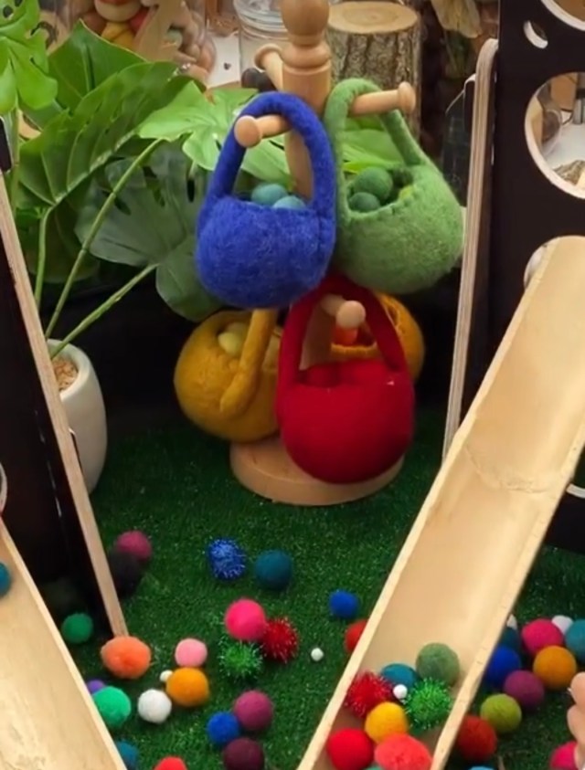 Finlay loves these beautiful and vibrant felt bags and balls from Cosy Direct – hang them from a wooden tree mug for a simple self select resource.