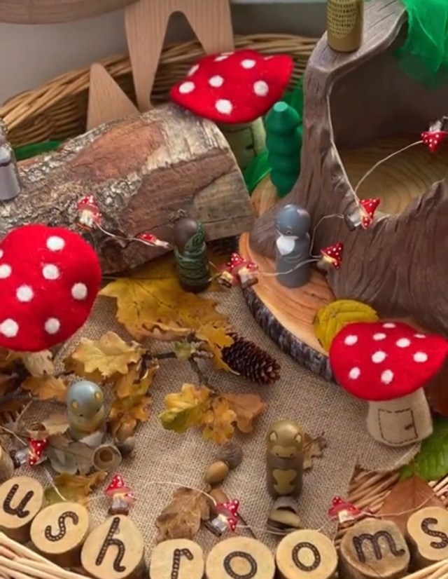 We also use lots of FREE natural treasures as ingredients for our mud kitchen – go on a treasure hunt in each of the seasons to collect treasures for your mud kitchen – acorns, pinecones, conkers, shells, pebbles, leaves, wildflowers. We store them in the plastic Potion Jars for self select.