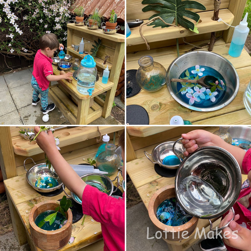- Playdough: We also love to add playdough to the mud kitchen – pressing in items that we have in the mud kitchen or using it to make little cakes to decorate with daisys or buttercups.