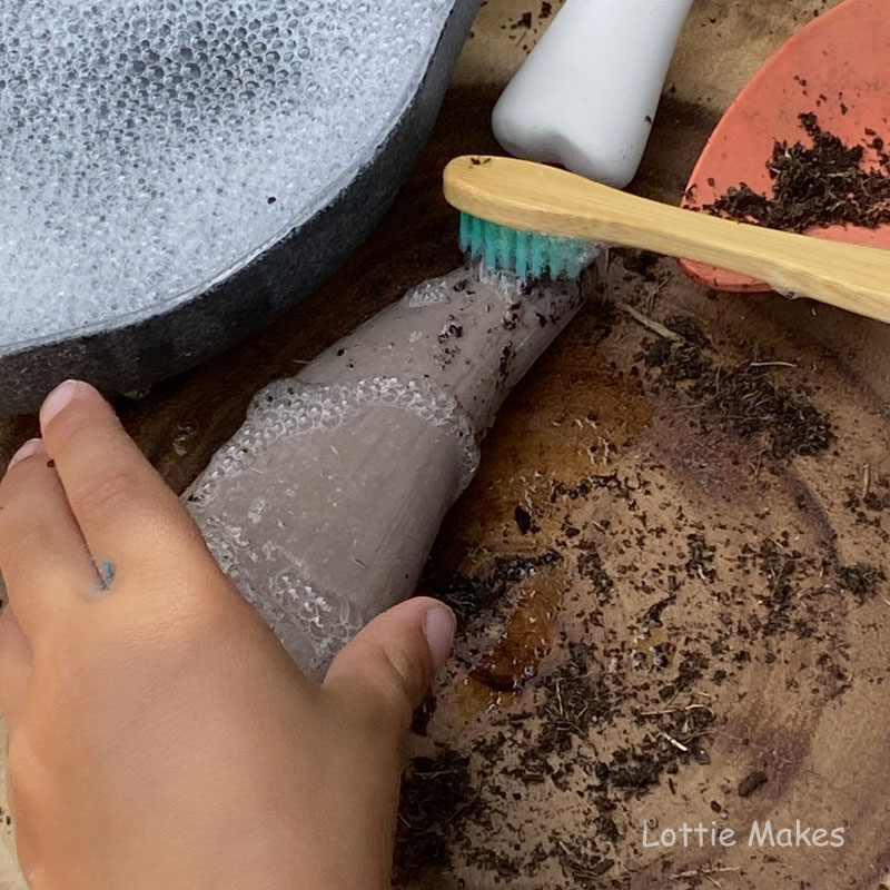 Adding maths and measure to play. We love these bones from Yellow Door. We use them not only in dino play but also in the mud kitchen and also around halloween. We also recently bought the Dinosaur APP to go alongside the bones and match and measure cards – it was lovely to add on activities to resources that we have used for a while to gain further interest and learning. And with the children keenly into their devices, this APP is a great way to engage them in learning.
