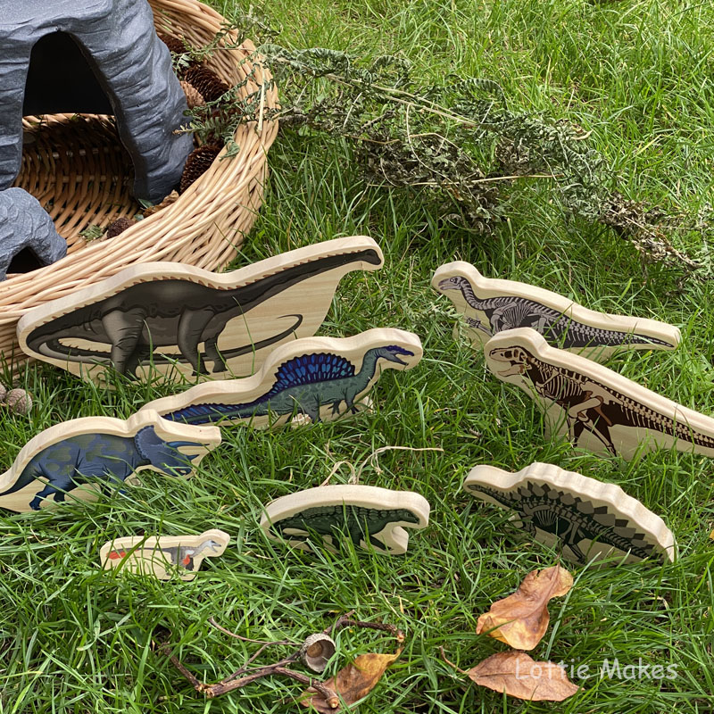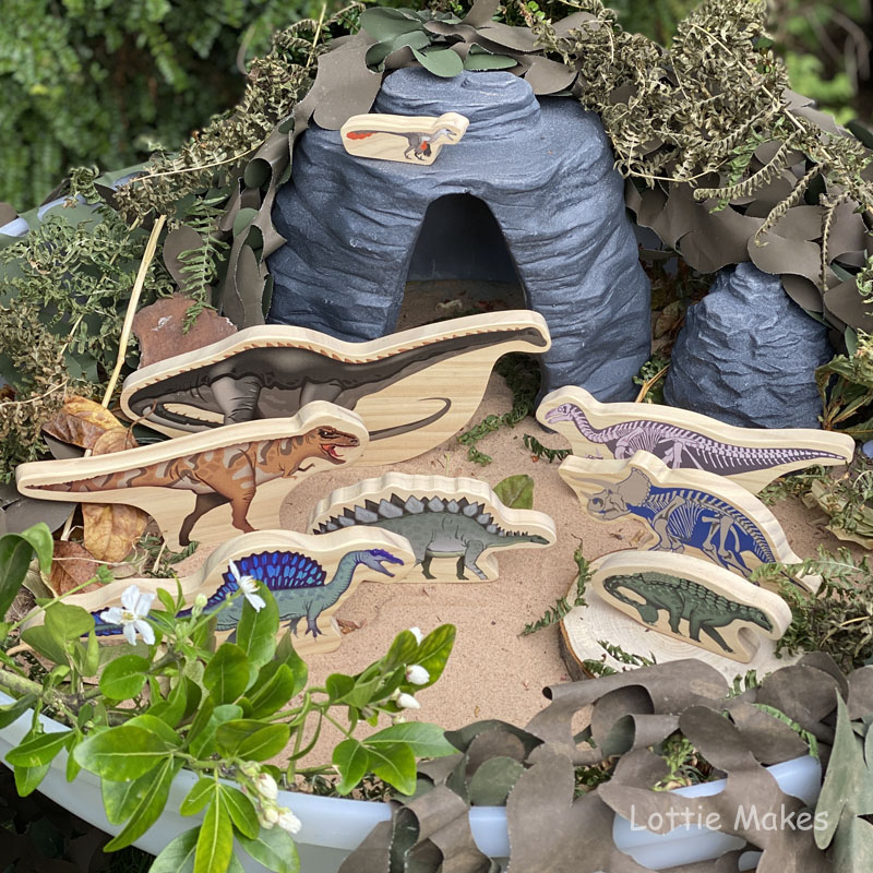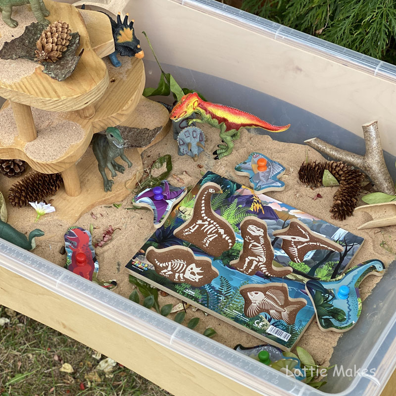 As dinosaur play is such a popular activity here I regularly set up a station to explore. Both indoors or outdoors. Here’s a few of our recent set ups. We have loved the addition of this wooden section tray from Steg and Rex too!
