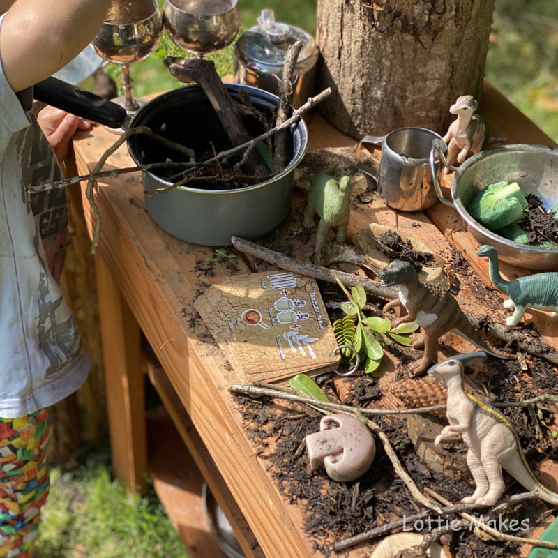 Now this has been a very popular mud kitchen theme for us. If your children have an interest in dinosaurs, they will love a mud kitchen themed in this way! We love this Mud Kitchen from Millhouse and we dress it regularly with a different theme for play.