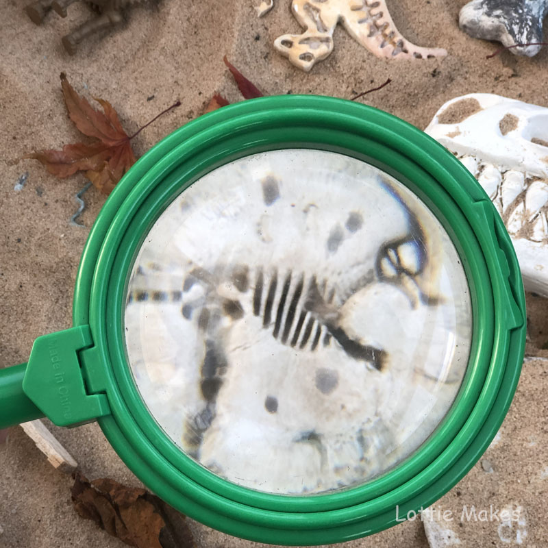 Using a sensory base such as sand or mud, bury some fossils and bones for children to discover – include a brush, a mini spade, a magnifying glass. Can the children identify the bones?