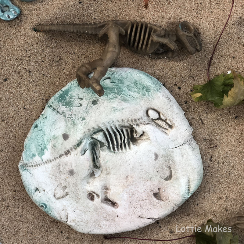 Use air dry clay to make your own fossils. Press Dino skeleton figures into the clay, let them dry then paint them. We loved this activity and they have lasted years.