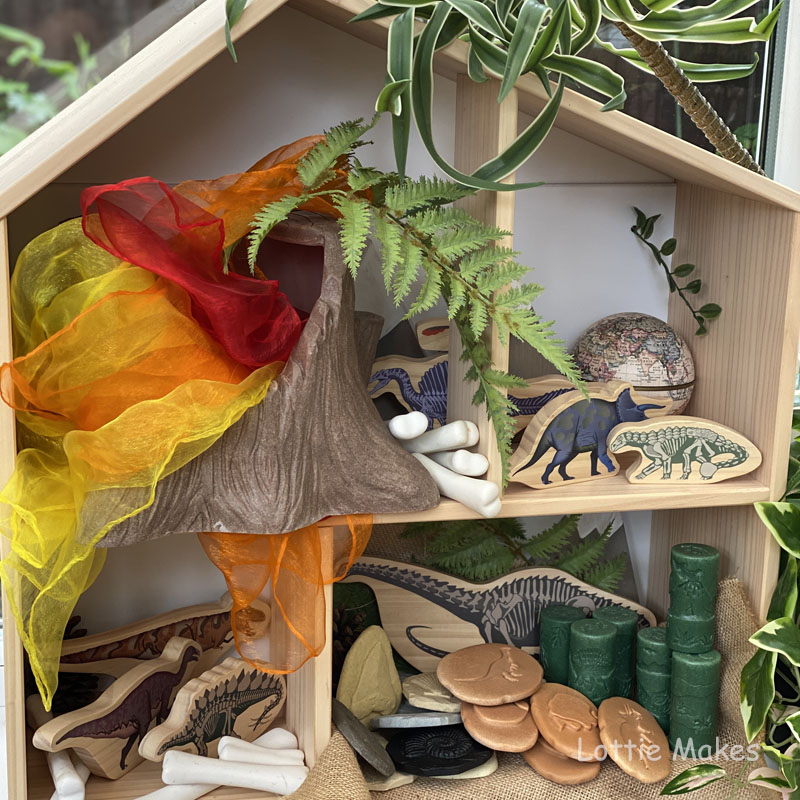 I added a variety of dino accessories to our dolls house from ikea. We love this house for not only small world play but also display an array of resources to explore and discover.